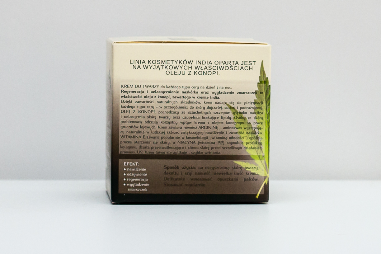 India ansigtscreme med cannabisolie forbedrer elasticiteten af overhuden, udjævner rynker og regenererer denne da cannabisolien gør der nemmere for cremens aktive elementer at trænge ind i huden.